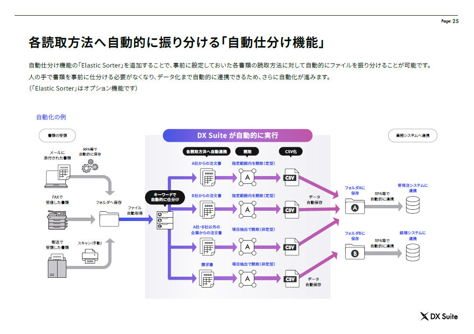 ファイルの自動取得、書類の自動仕分け、読取箇所の自動設定、OCR結果の自動チェック、出力ファイルの自動保存などのタスクを、標準搭載のAIエージェントが人の代わりに実行します。