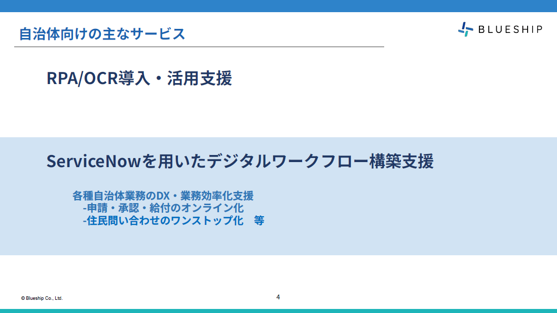 ITサービス開発・運用・保守および販売(ServiceNow, AI-OCR, RPA, Quady)ならびに受託およびそれらに付帯するコンサルティング業務を提供しております。