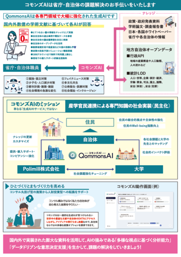 QommonsAIは、Polimillが提供する、自治体業務に特化した複数の高機能生成AI群の総称です。
