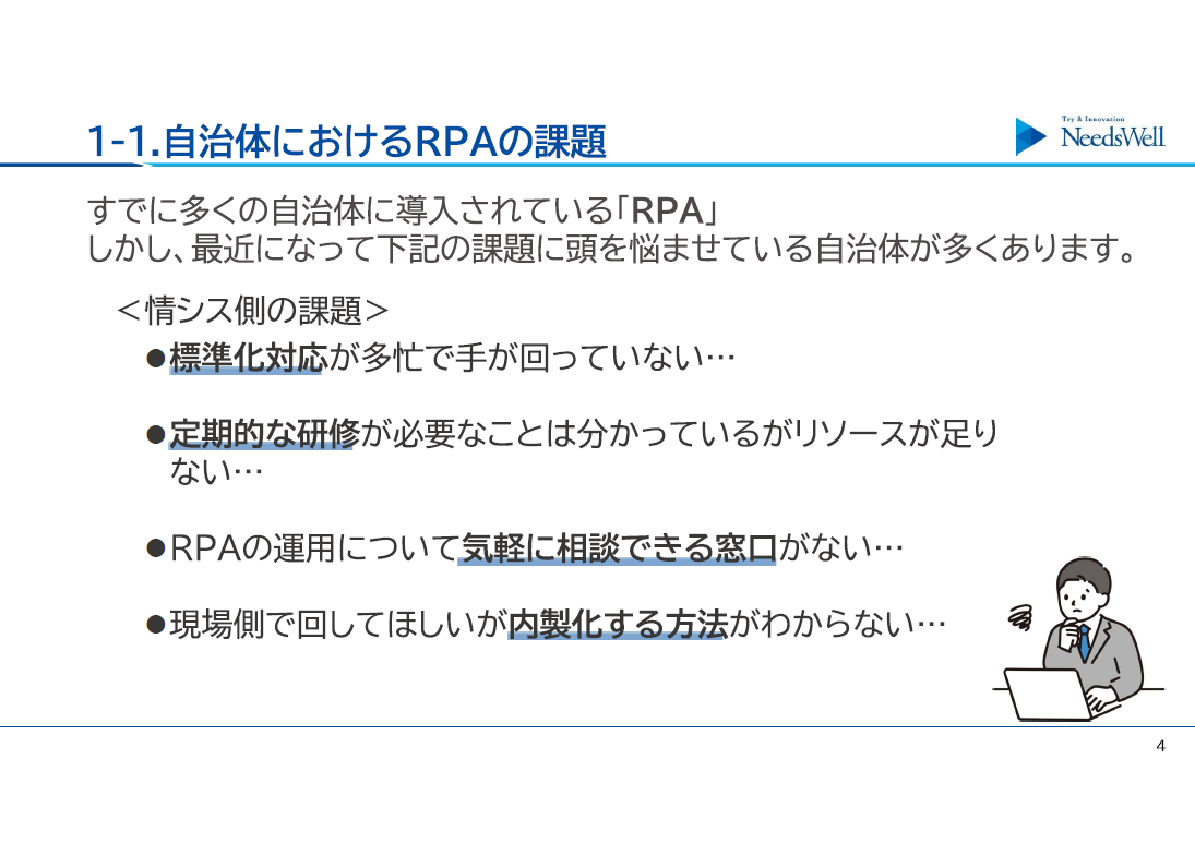 「Winactor®」をはじめとするRPAツールは、全国で807団体の自治体(※)が導入されていますが、導入後の安定稼働に課題を感じ、RPAの運用自体に苦慮されている自治体も多くあります。最近では運用支援を外注する自治体も増えており、RPAの運用における自治体の課題が浮き彫りになってきています。