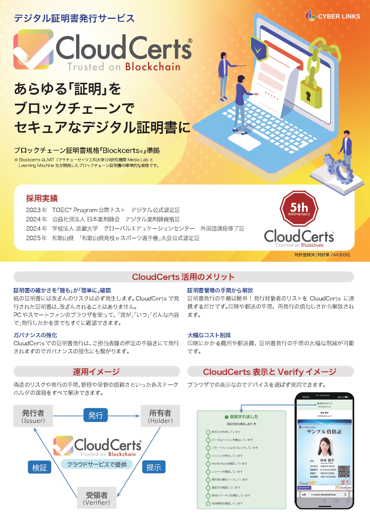 あらゆる証明書や資格をブロックチェーンで改ざんできないデジタル証明書として短期間でオンライン発行し、スマホやパソコンから簡単即時検証可。Blockcerts準拠で安心安全な利用。