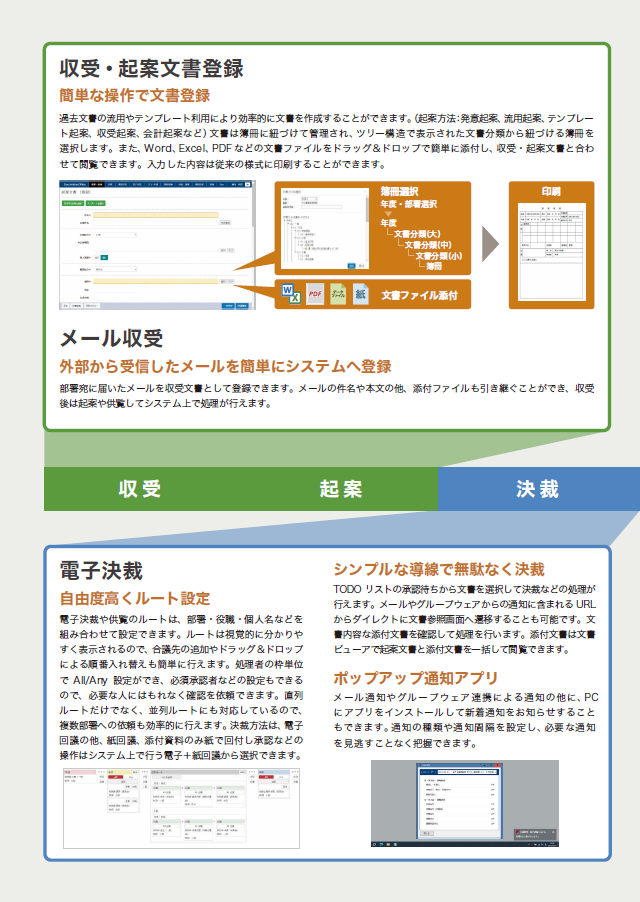 収受→起案→決裁→施行→保存→廃棄までの文書ライフサイクル管理をスムーズに行えます。