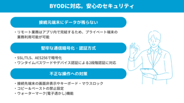 接続元の端末にデータを残さないため、プライベート端末の業務利用(BYOD)が可能です。