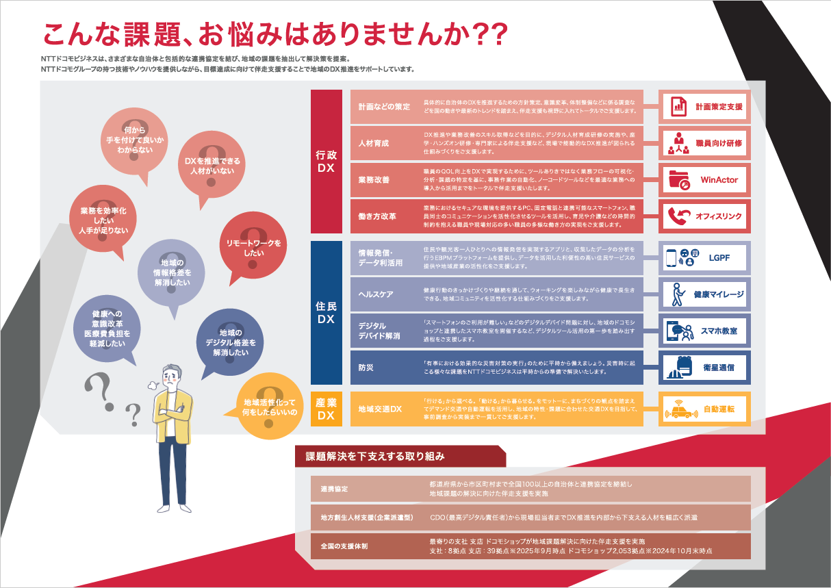NTTドコモビジネス株式会社は、すべてのお客さまの経営課題や産業・地域課題を解決する「産業・地域DXのプラットフォーマー」として、地域が抱える社会課題の解決や地域活性化に向けた様々なICTソリューションを展開しています。全国の拠点と豊富な導入実績を強みに、自治体をはじめとする地域の皆さまの頼れるパートナーとして地域の未来を変える一歩を共に踏み出していきます。●こんな課題・お悩みはありませんか?