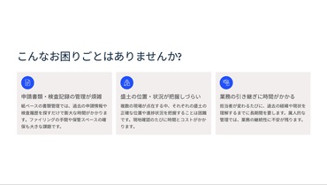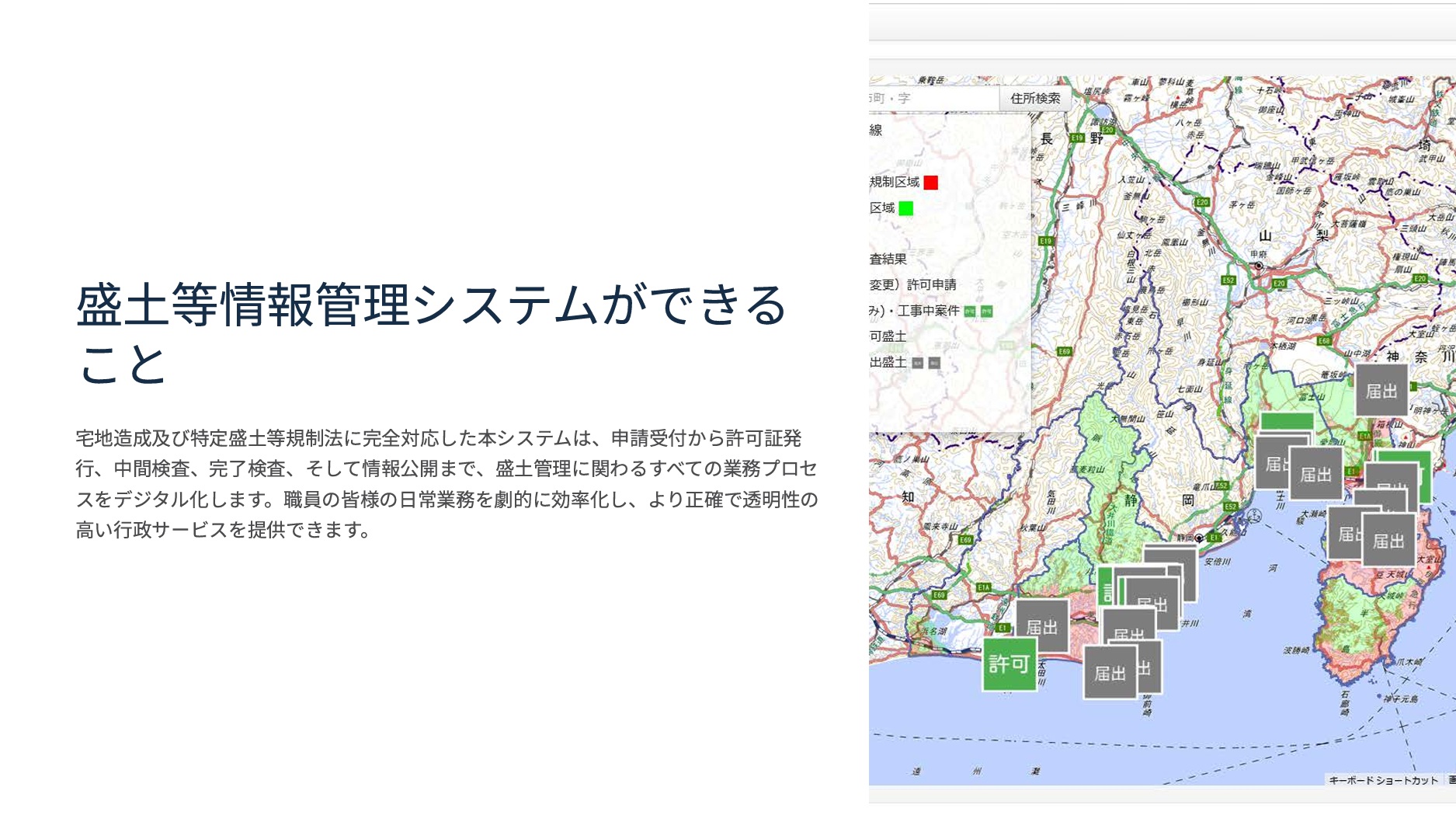 盛土業務のすべてを“ひとつの画面”で完結できる、自治体専用の統合プラットフォームです。