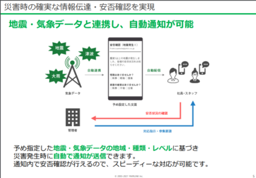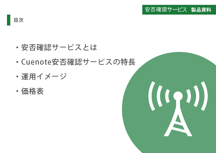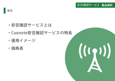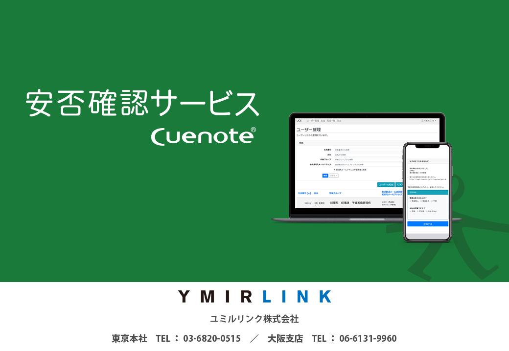 「Cuenote 安否確認サービス」は、地震や気象警報発令時などをはじめとした緊急時に職員・従業員の安否状況の確認を「迅速・確実・簡単」に行える災害時情報伝達サービスです。