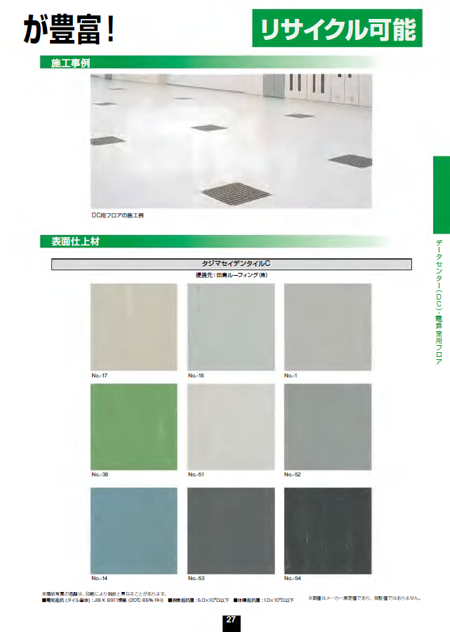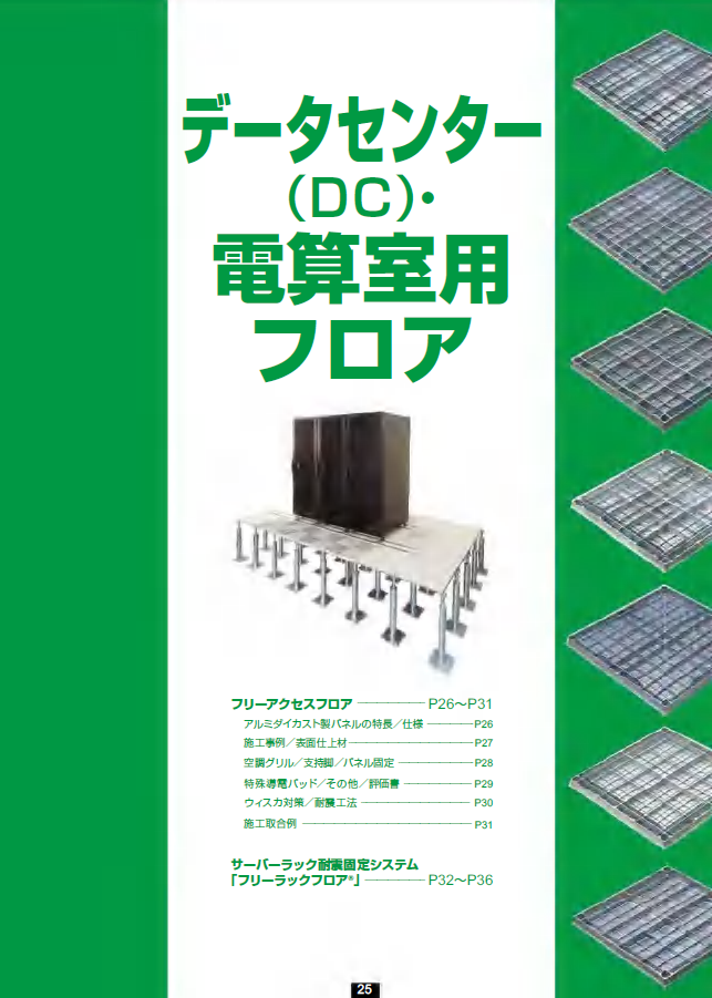 帯電防止性能を有したアルミダイカストフロア、耐震固定のフリーラックフロア、サーバー等の精密機器を地震から守る免震床システムなどで各種ニーズに対応。