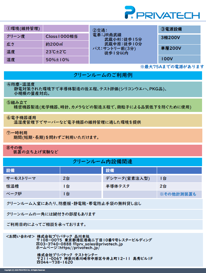 半導体試験環境を利用し埃の影響が少ない環境で精密部品の組み立て、 或いは温湿度管理された環境下での機器の保管など用途に合わせて活用いただけます。