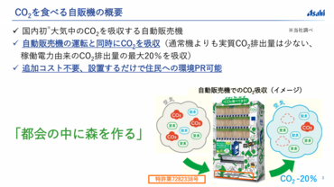 CO₂吸収材は、吸収材の加工や輸送時のCO₂排出量よりもCO₂吸収量が上回る副産物(元々捨てられていた素材)を加工・使用しているため、通常の自動販売機よりも環境負荷が低い(実質CO₂排出量が少ない)。