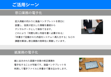 自治体業務のデジタル化、効率化にワコムは液晶ペンタブレットという製品を通じてお手伝いをさせていただいております。この資料は液晶ペンタブレットをご導入いただき業務のデジタル化を実現した事例を紹介しております。