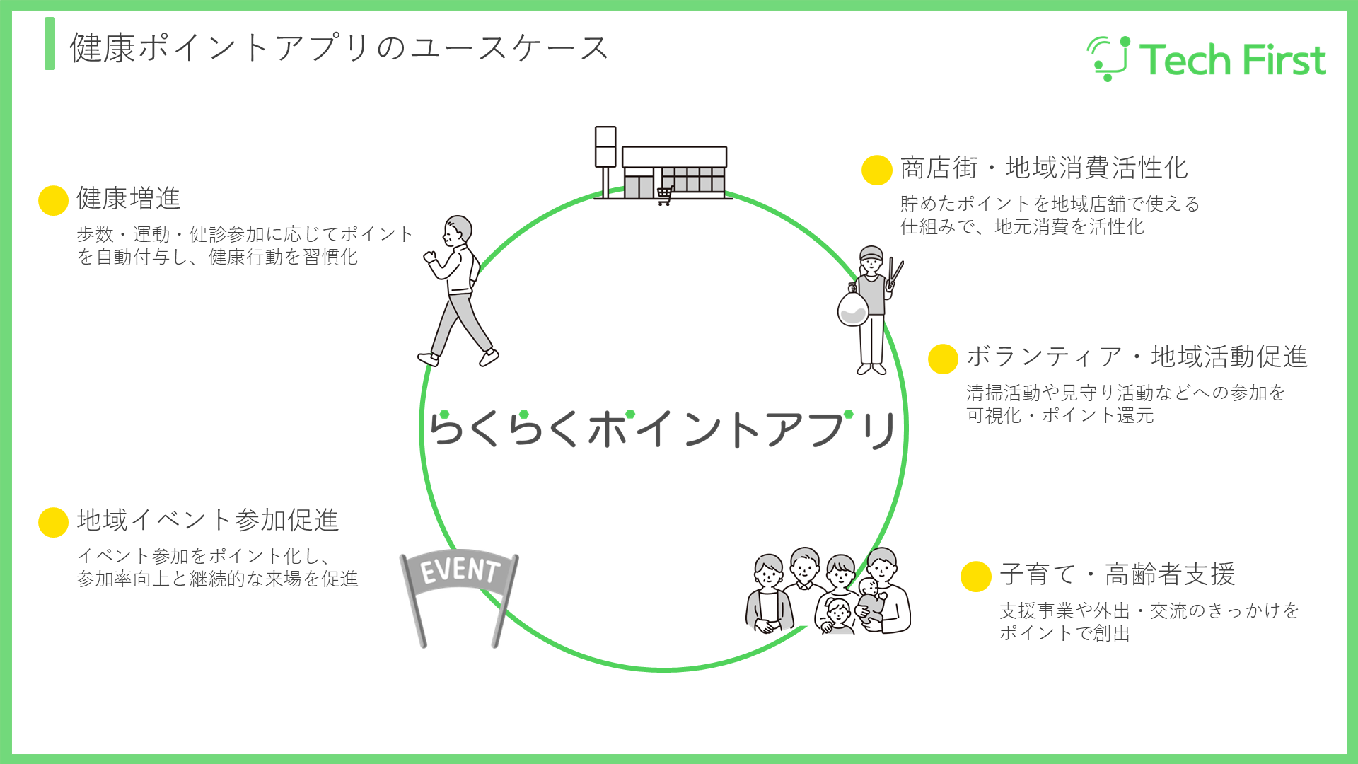 DX導入をしたいけれど、「何から始めれば良いのかわからない」「人手が不足している」「予算がない」こういったお悩みはありませんか?テックファースト株式会社はこういった課題を抱える自治体のDX導入支援を様々な側面からしたいと考えています。テックファースト株式会社が提供する「らくらくポイントアプリ」は従来紙で管理されていたポイントをデジタル化し、効率的かつ効果的に管理するための地域ポイントアプリサービスです。