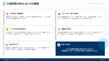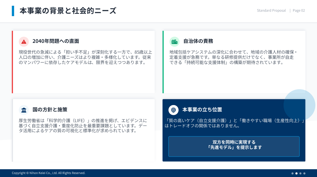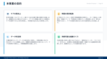 利用者の状態改善と介護現場の生産性向上を同時に進めることで、職員負担の軽減や人材定着にもつなげ、事業終了後も地域に残る「介護モデル」の構築を目指します。自立支援介護を地域全体で定着させたい自治体にとって、実行力と再現性を備えた提案内容となっています。