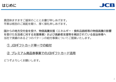 国からの重点支援地方交付金を受け、給付事業を検討されている自治体様へ当社で実績のある給付事業についてご提案いたします。 ①JCBギフトカード単一での給付 ②プレミアム商品券事業