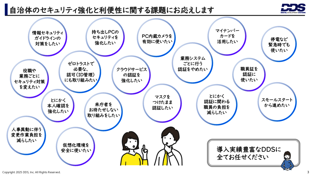 物理サーバーにも、仮想サーバーにも、オンプレミスでもクラウドでも、環境や課題にお応えできるソリューションを揃えています。ID統合管理、本人認証、ログ管理、ゼロトラストの考えの要となる部分をカバーし、自治体DXをパスワードレスで支援します。