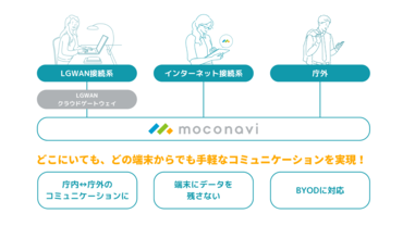 「moconavi LGWANクラウドコミュニケーションサービス」を導入すれば、LGWAN接続系・インターネット接続系・庁外にいる職員との円滑なコミュニケーションを実現します。テレワークのコミュニケーション効率化にも最適です。