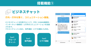 【メリット】●ご利用中の庁内PCやお持ちのモバイル端末(スマホ・タブレット・PC)を使って、LGWAN接続系・インターネット接続系・庁外のコミュニケーション基盤を構築します。手軽に職員間でセキュアなビジネスチャットが使えるようになります。