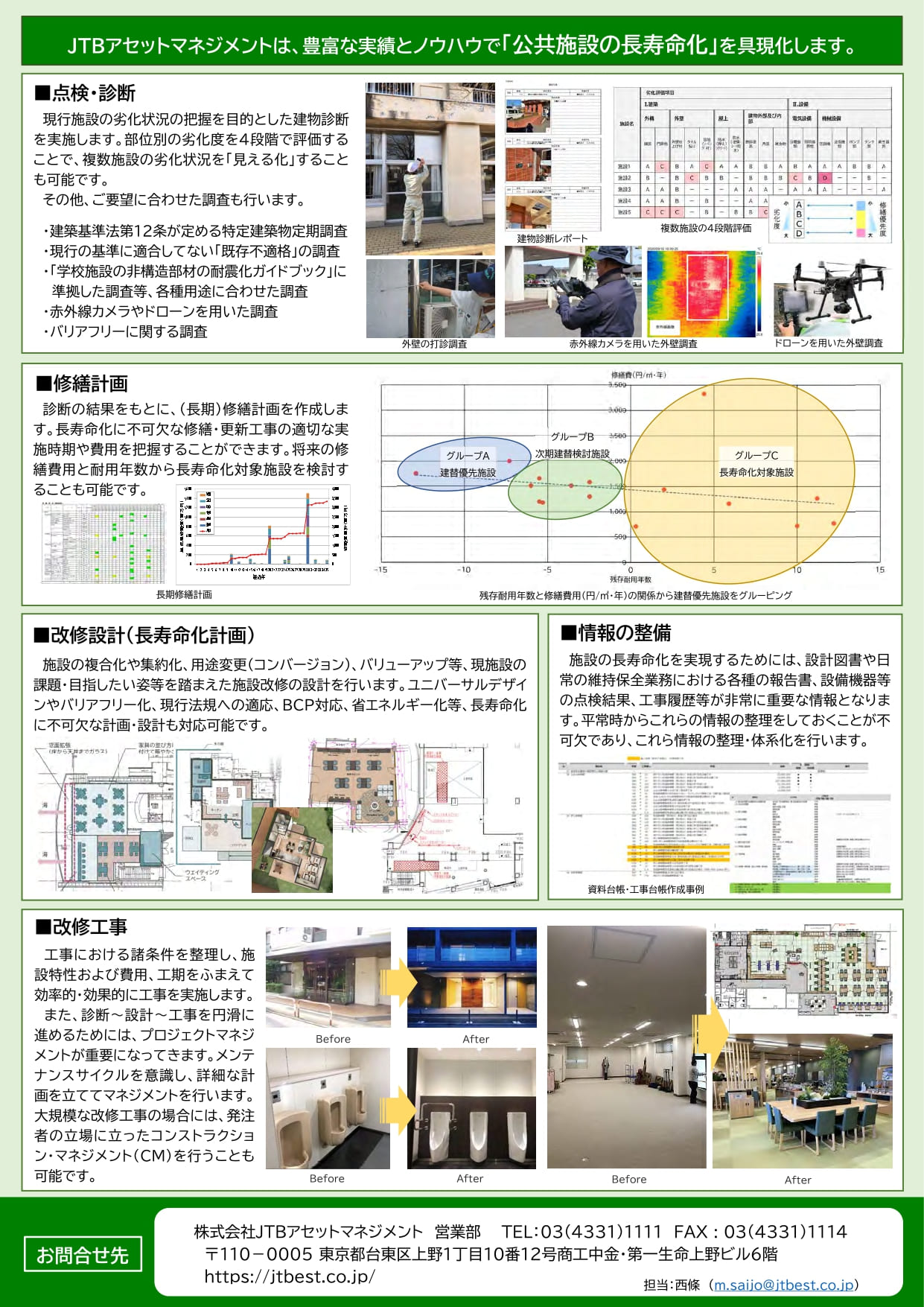 劣化状況・耐震性・経済性を総合評価し、予防保全対象施設を選別。実効性ある長寿命化計画を策定します。