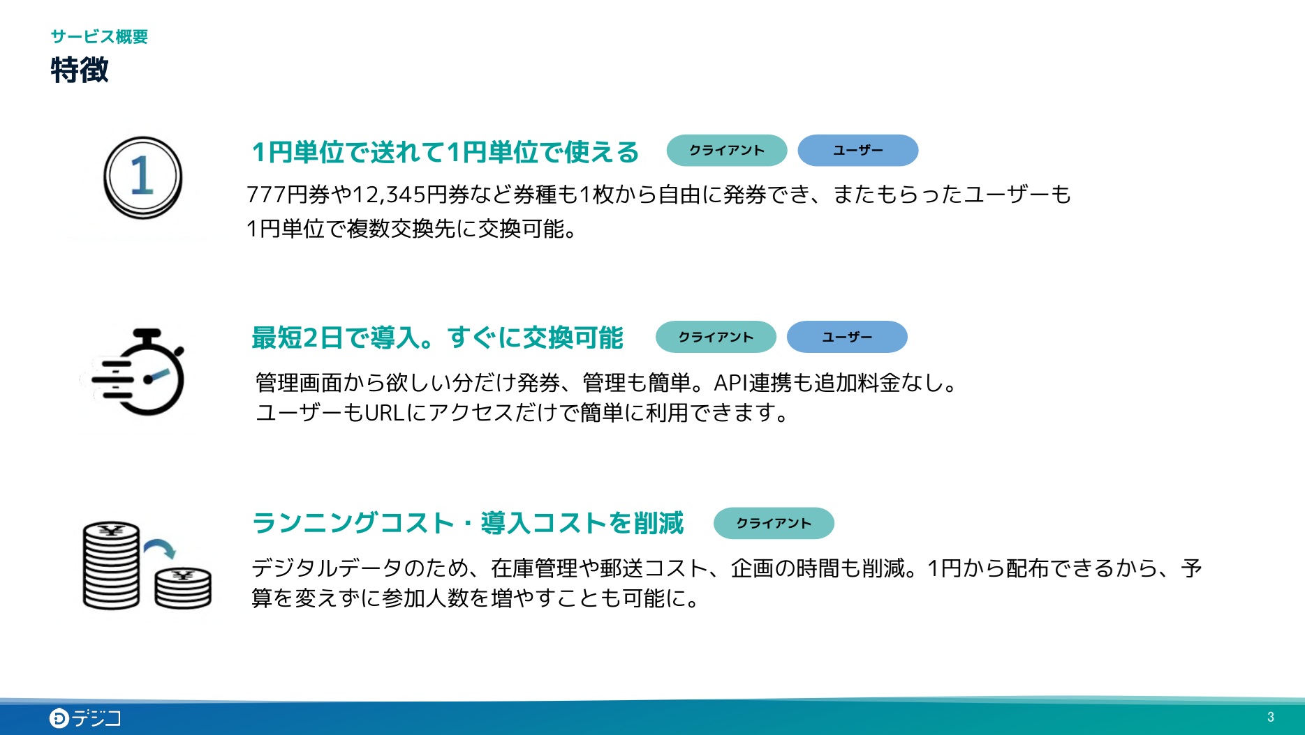 デジコは、行政の効率化と住民の利便性向上を両立し、「迅速」「簡単」「満足」の三方よしを実現する、次世代のインセンティブ提供手段です。