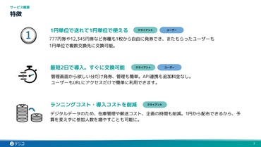 給付金・補助金・キャンペーン景品などに使える、オンラインで簡単に受け取れるデジタルギフトです。1円から発行可能で、最大6,000種類の交換先を自由に選べ、高い満足度を実現します。