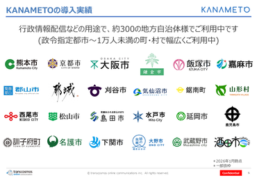 北海道苫小牧市様、青森県三沢市様、岩手県釜石市様、宮城県気仙沼市様、秋田県由利本荘市様、山形県酒田市様、福島県郡山市様、茨城県水戸市様、栃木県足利市様、群馬県みどり市様、埼玉県川越市様、千葉県袖ヶ浦市様、東京都江東区様、神奈川県藤沢市様、新潟県佐渡市様、富山県黒部市様、福井県大野市様、長野県辰野町様、岐阜県美濃市様、静岡県静岡市様、愛知県刈谷市様、三重県川越町様、滋賀県長浜市様、京都府京都市様、大阪府東大阪市様、兵庫県淡路市様、奈良県広陵町様、和歌山県和歌山市様、鳥取県日吉津村様、島根県出雲市様、岡山県高梁市様、広島県熊野町様、山口県宇部市様、香川県高松市様、愛媛県松山市様、高知県佐川町様、福岡県福津市様、佐賀県佐賀市様、長崎県東彼杵町、熊本県熊本市様、大分県大分市様、宮崎県都城市様、鹿児島県鹿児島市様、沖縄県名護市様など (2026年1月末時点/当社調べ)