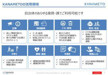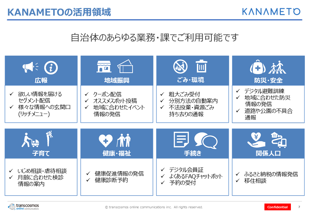 KANAMETOは、LINEユーザの属性に合わせたセグメント配信や問合せに自動応答できるチャットボットの導入によって、より住民から求められる効果的な情報配信を実現するサービスです。