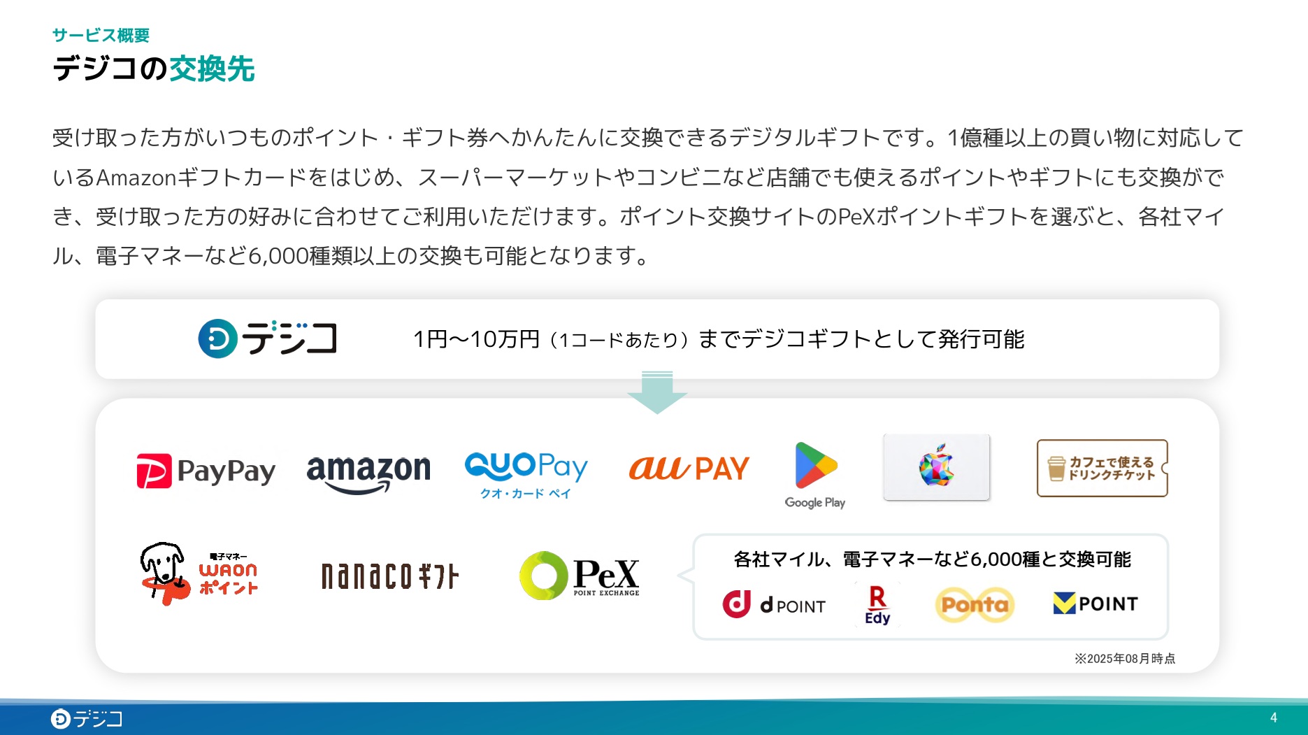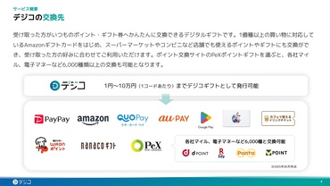 最大の特長は、各種電子マネー、ポイントなど最大6,000種類の豊富な交換先から「今欲しいもの」を自由に選択できる点です。