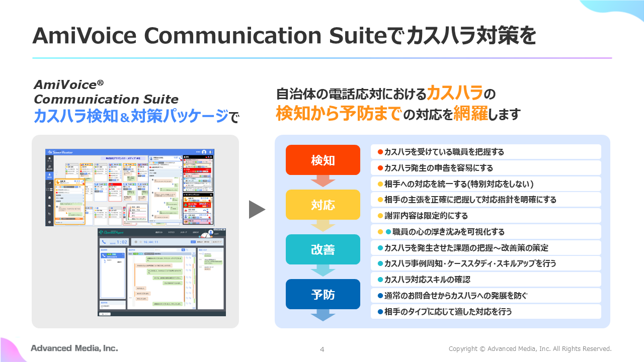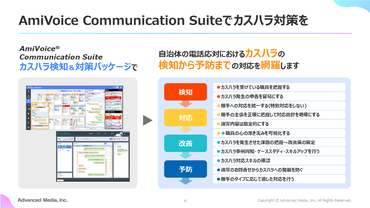 代替が効かない行政サービスの特性上、自治体職員へのカスタマーハラスメント(カスハラ)は深刻な課題です。対応がエスカレートしやすい「公僕」としての立場に加え、電話という記録が残りにくい手段での応対が多い中、職員の心身に大きな負担がかかっています。そこで注目されているのが、電話応対向け AI音声認識ソリューション「AmiVoice Communication Suite」です。「AmiVoice Communication Suite」で提供しているカスハラ検知&対策パッケージでは、通話中の不適切発言をリアルタイムで検知し、職員への心理的サポートや管理者の判断支援、さらには会話終了後の分析まで、包括的にカバーします。
