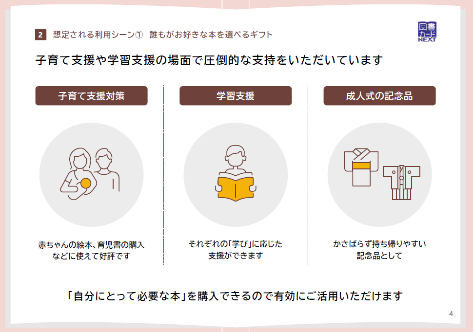 図書カードNEXTは全国の加盟書店約6,500店(2024.10月現在)と一部オンライン書店で使える、本屋さんの商品券。あらゆる年代の方々に、自分で本を選ぶ楽しみを届け、読書の感動や学ぶ喜びをもたらします。子育て支援・学習支援・物価高騰対策・シティプロモーションなど、アイデア次第でどのような場面でもご活用いただけます。◆こんなお悩みありませんか?