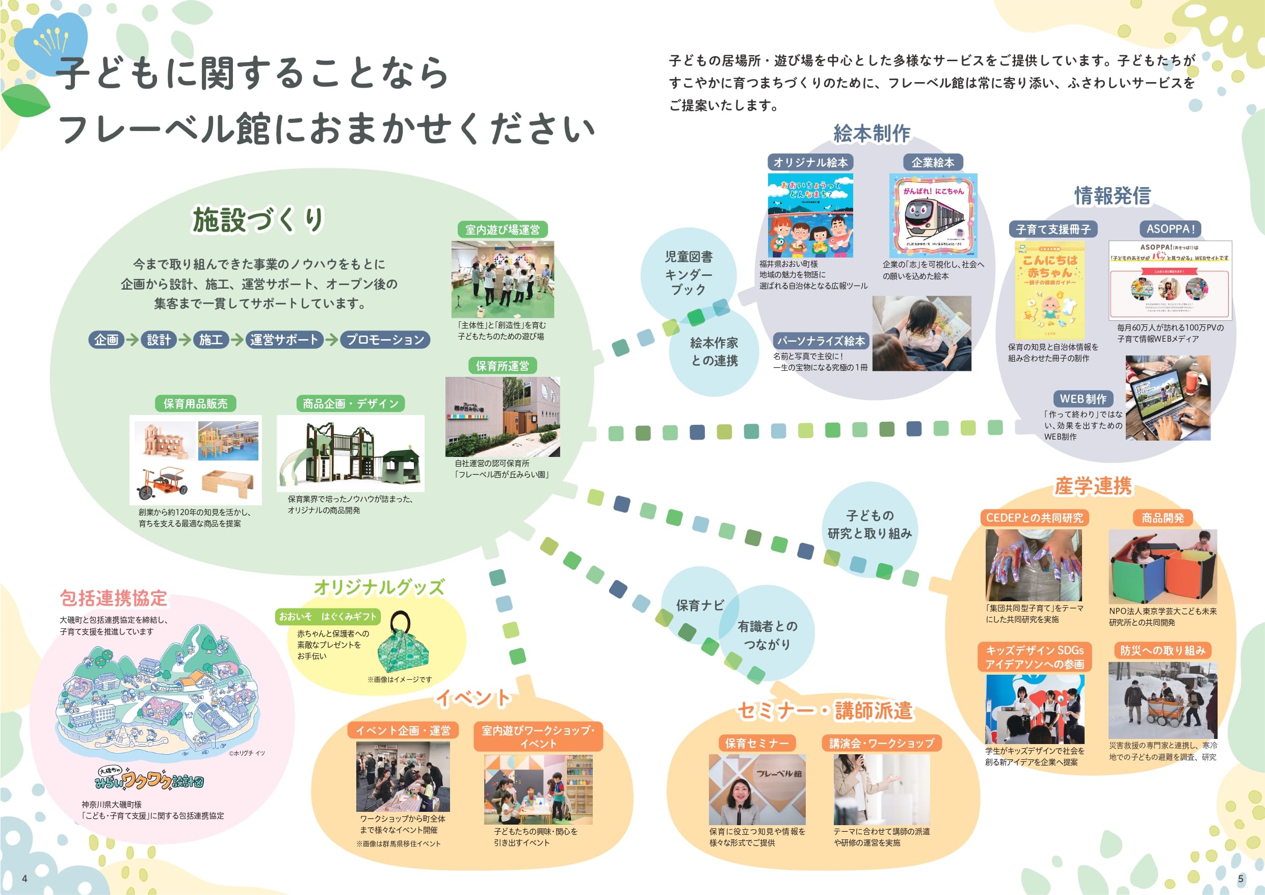 子どもに関することならフレーベル館におまかせください。子どもの居場所あそび場を中心とした多様なサービスを提供できます。「育つ広場」の発展、充実のために、フレーベル館は常に寄り添い、ふさわしいサービスを提案、実施できます。