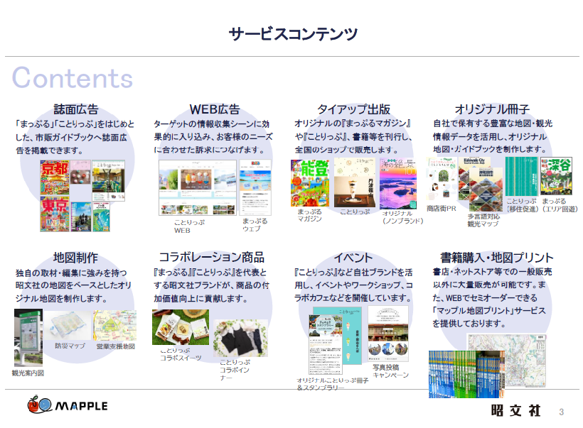 「まっぷる特別編集版」などの観光ガイドブック、インバウンド向け多言語マップ制作、スタンプラリーや写真投稿キャンペーン等のイベント企画・運営