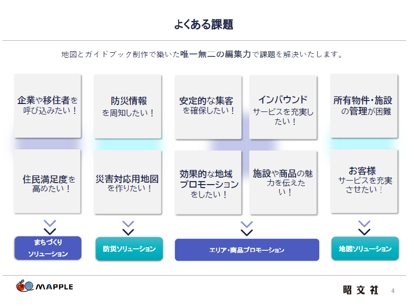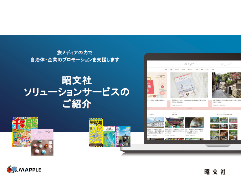 長年にわたり「まっぷる」や「ことりっぷ」、「山と高原地図」など、信頼される地図・旅行ガイドブックを出版してきた昭文社のソリューションサービス総合資料です。地図製作で培った高い技術力、ブランド力、そして紙とWEB双方を扱うメディア力を活かし、観光プロモーション、シティプロモーション、防災対策、インバウンド対応まで、自治体や企業が抱える多様な課題をワンストップで支援します。