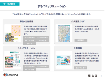 「まっぷる」「ことりっぷ」などのブランドを活用したシティプロモーション冊子、移住・定住促進ガイド、企業誘致パンフレット、公共施設ガイドマップ等の制作、イベント運営